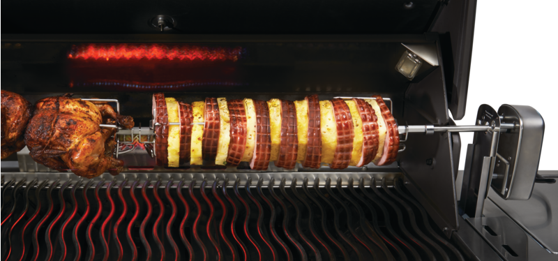 - Load the spit rod with your choice of meat, or rotisserie accessory full of food taking care to balance the load and ensuring it will sit aligned with the rear burner. Then replace it on the grill, fitting the end of the rod into the rotisserie motor. Turn on the rotisserie motor.