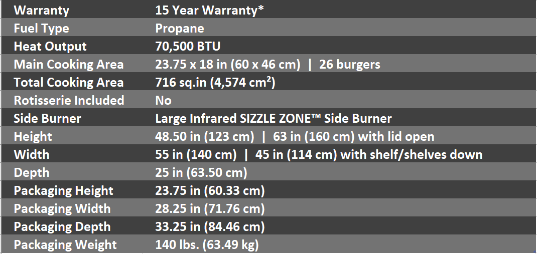 - REAR INFRARED BURNER: Featuring an infrared rear rotisserie burner for perfect spit roasted meals. Rotisserie sold separately